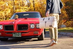 Removable shoulder strap with debossed Vegan Leather patch that doubles as a sunglass holder
