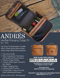 The stylish and compact Andrés leather hanging dopp kit is the perfect travel companion! This product is crafted from top grain cowhide leather and durable, easy to Clean Mocha Brown Nylon Lining. The Andrés not only keeps your luggage light, but exceptionally well organized as the pockets can fit everything securely like larger shaving kits and deodorant sticks to small creams and tweezers. It is accented with antique brass-finish hardware.